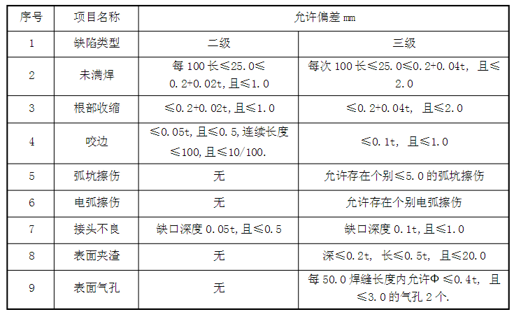 5、鋼結(jié)構(gòu)焊接:焊條、焊絲、焊劑等焊接材料與母材的匹配應(yīng)符合設(shè)計(jì)要求及現(xiàn)行行業(yè).標(biāo)準(zhǔn).《建筑鋼結(jié)構(gòu)焊接技術(shù)規(guī)程》JGJ81 的規(guī)定,焊條、焊絲、焊劑在使用前按其說(shuō)明書及焊接工藝的規(guī)定進(jìn)行烘焙和存放。焊工須持證上崗,在其認(rèn)可范圍內(nèi)施焊,焊接時(shí)采用合理的焊接工藝,以減少由焊接產(chǎn)生的變形和應(yīng)力,確保焊縫和構(gòu)件的質(zhì)量。本工程零部件連接處均需滿焊,焊縫厚度按設(shè)計(jì)要求,焊接時(shí),盡量減少接縫數(shù)量,拼接應(yīng)按等強(qiáng)度連接原則,選擇合適的焊接工藝和剖口形式,并設(shè)置在預(yù)應(yīng)力較小部位,焊縫表面不得有裂紋、焊瘤等缺陷,表面無(wú)氣孔、夾渣、弧坑、電弧擦傷等缺陷,焊縫不得有咬邊,未焊滿根部收縮等缺陷,力求做到外形均勻,成型較好,焊縫與焊縫,焊縫與基層過(guò)渡平滑,焊渣和飛濺物須清理干凈,二、三級(jí)焊縫處外觀質(zhì)量標(biāo)準(zhǔn)見(jiàn)下表: